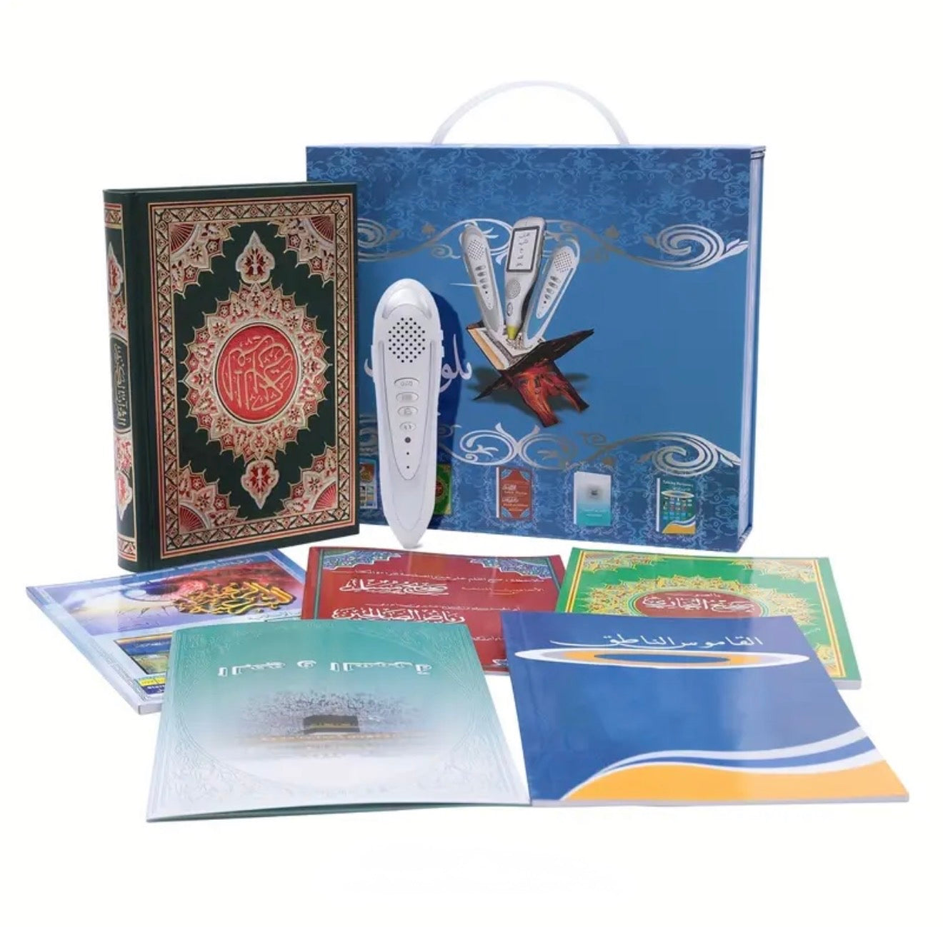 Premium box with Quran, pen, manuals, and accessories